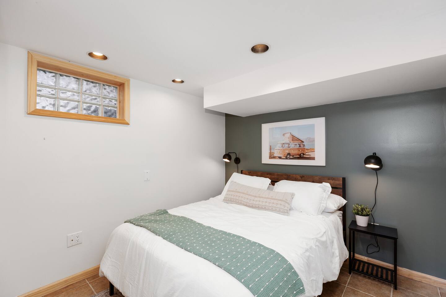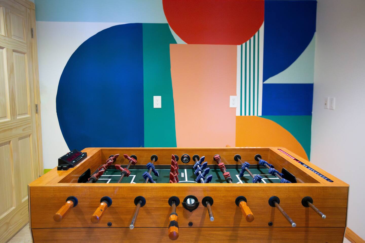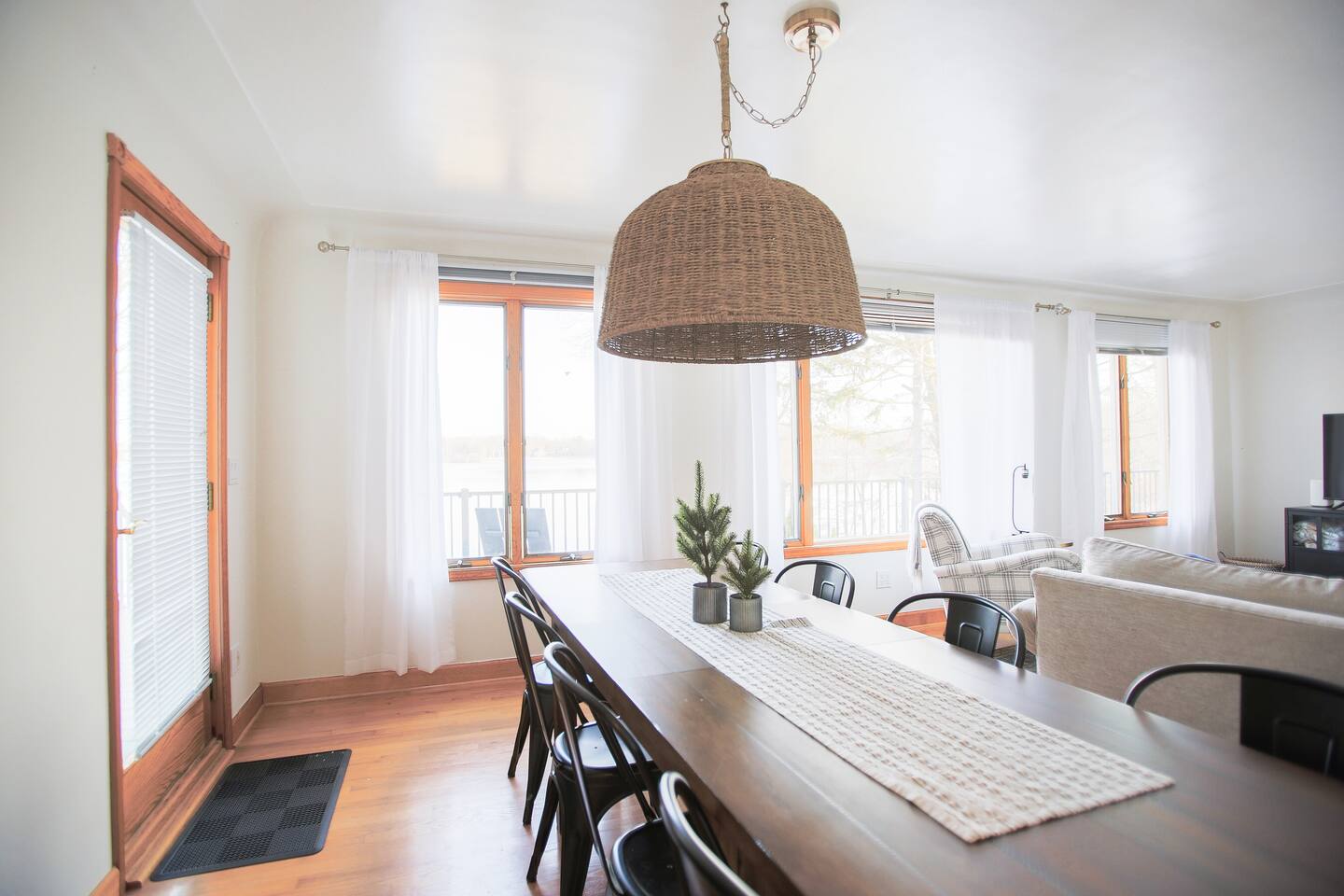 This four-bedroom home is designed for comfort and making memories, with two levels for your group to spread out and enjoy. Living & Dining: The main living and dining area offers a beautiful, panoramic view of the lake, with comfortable seating for your group to gather. Kitchen: A stocked kitchen, complete with pots, pans, a blender, and baking sheets. We provide coffee, creamer, oil, and basic spices to get you started. Bedrooms: The home comfortably sleeps your group across four bedrooms. The two upstairs bedrooms feature king-sized beds. One bedroom has a dedicated workspace. The lower level includes two additional bedrooms, one of which is a bunk room perfect for kids. A pack 'n play is available. Bathrooms: Two full bathrooms ensure convenience for everyone. The upstairs bathroom includes a bathtub, while the lower-level bathroom has a walk-in shower and a washer/dryer for your use. Game Room & Entertainment: Head downstairs to the game room for some friendly foosball competition. The home is also equipped with two large smart TVs for movie nights. Outdoor Oasis: The backyard is an extension of the living space. Enjoy barbecues on the large deck with the included grill (available seasonally). The hot tub is open year-round. In the evenings, gather around the fire pit. For water fun, a play structure with a slide, kayaks, and a paddle boat are available for your enjoyment (seasonally).